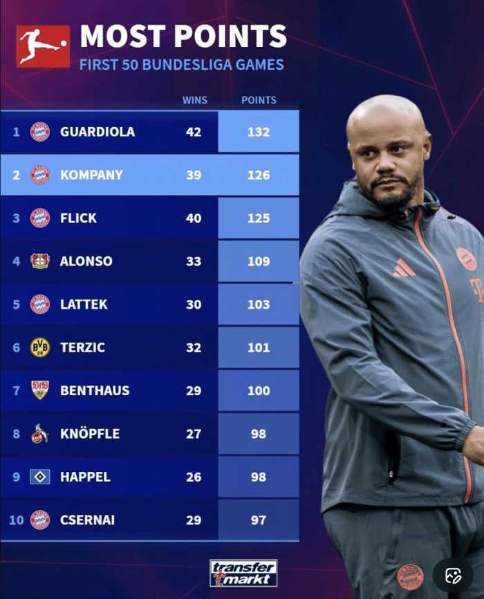 虎扑01月14日讯 根据德国转会市场的统计,孔帕尼是德甲联赛历史上执教前50场获得积分第二多的教练,仅次于瓜迪奥拉。