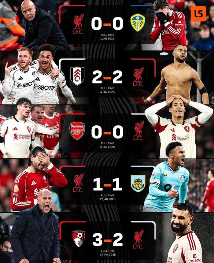 #伯恩茅斯3比2利物浦# 进入2026年后,利物浦联赛先后0-0利兹联、2-2富勒姆、0-0阿森纳、1-1伯恩利,随后又在伯恩茅斯身上丢掉到手的1分——五轮联赛4平1负,仅拿到4分(全拿满的话15分)。