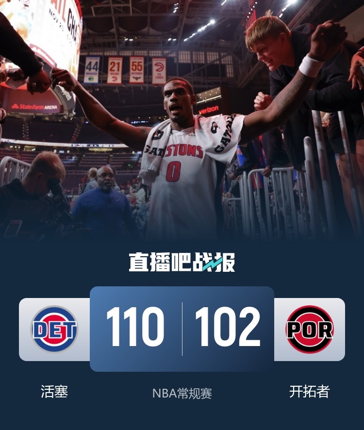 比赛开场,两队展现球队特点,展开对攻战,但活塞以更高的成功率很快取得领先优势,康宁汉姆进攻端连续打成,夏普则撑起开拓者进攻,首节结束活塞30-26领先。次节回来,活塞延续攻势,开拓者则连续出现失误,分差很快被拉开到两位数,半场结束活塞61-51保持领先。易边再战,杜伦在篮下翻江倒海予取予求,分差一度被拉开到20分以上,克林根在节末攻防两端发挥,开拓者78-95落后进入第四节。末节回来,场上形势风云突变,康宁汉姆六犯下场,活塞进攻端断电,开拓者趁机打出一波22-4,卡马拉外线命中后开拓者反超比分,双方陷入拉锯战,终场结束前开拓者进攻端冷却,活塞打出一波10-2,有惊无险将胜利收入囊中,最终活塞110-102力克开拓者。
