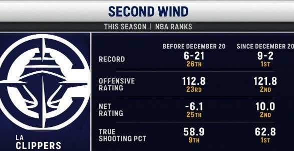 判若两队!快船近11场:战绩9-2、真实命中率都排同期联盟第一